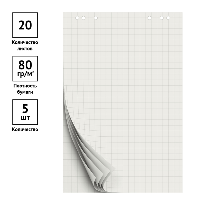 Блокноты для флипчарта ПЛОТНЫЕ 80 г/м2, ОФИСМАГ, КОМПЛЕКТ 5 штук, 20 листов, КЛЕТКА, 67,5х98 см, 127795