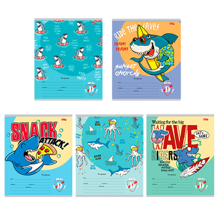 Тетрадь А5 12л " Проф-Пресс " косая линия с дополнительной горизонтальной Эконом Веселые акулы(ассорти), офсет, на скобе, обложка - мелованный картон, 5 дизайнов в спайке