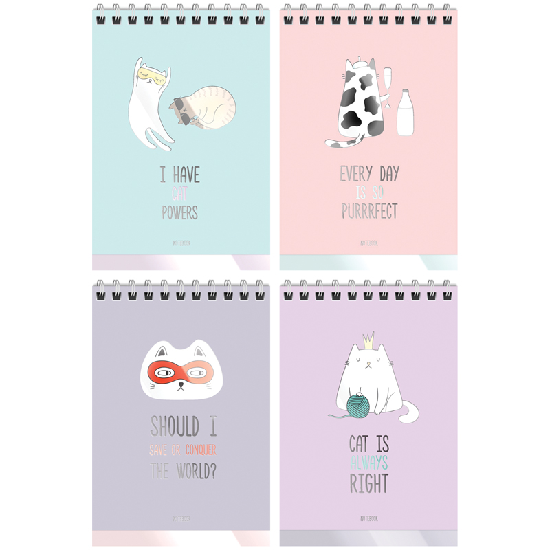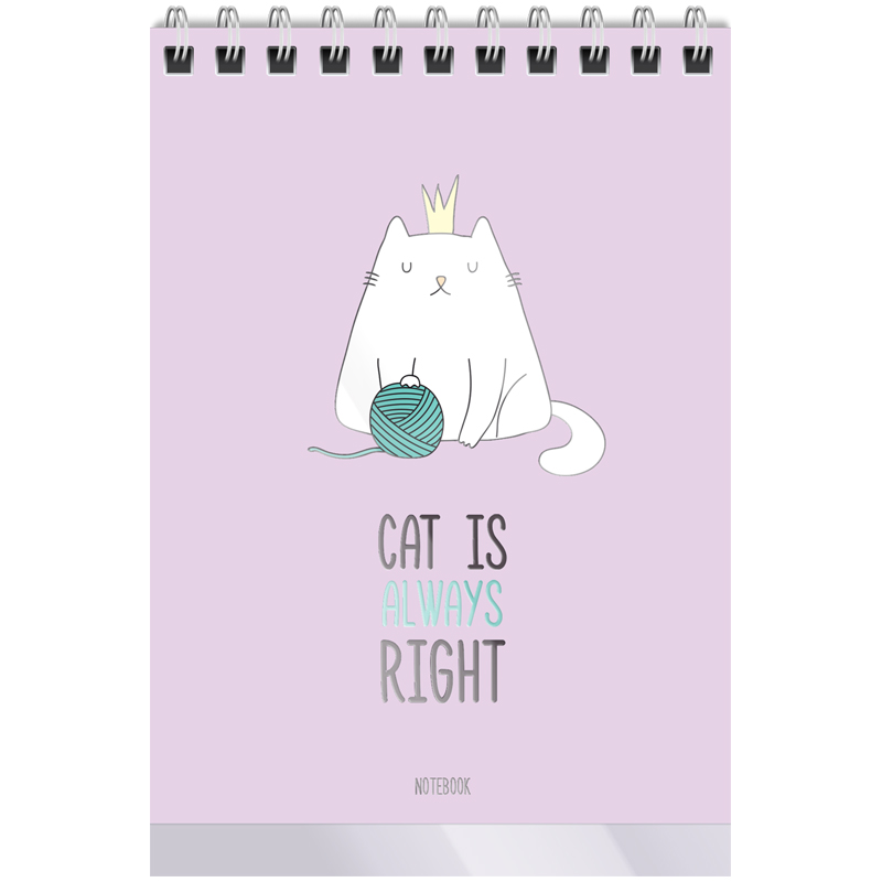 ВНИМАНИЕ: БОЛЬШИНСТВО ЭЛЕМЕНТОВ В НАБОРЕ МОГУТ ИМЕТЬ ОДИНАКОВЫЙ ДИЗАЙН <br/><br/>Блокнот Meshu Right Cat формата А6 прекрасно подойдёт для работы и учёбы.<br/>Состоит из 40 листов размером 110*145 мм офсетной бумаги белого цвета плотностью 60г/м2. Линовка – клетка. Обложка – мелованный картон с выборочным УФ-лаком. Милые котики на обложке блокнота поднимут настроение.<br/>• формат: А6 (110*145 мм);<br/>• кол-во листов: 40;<br/>• линовка: клетка;<br/>• вид скрепления: гребень/спираль;<br/>• материал обложки: картон.