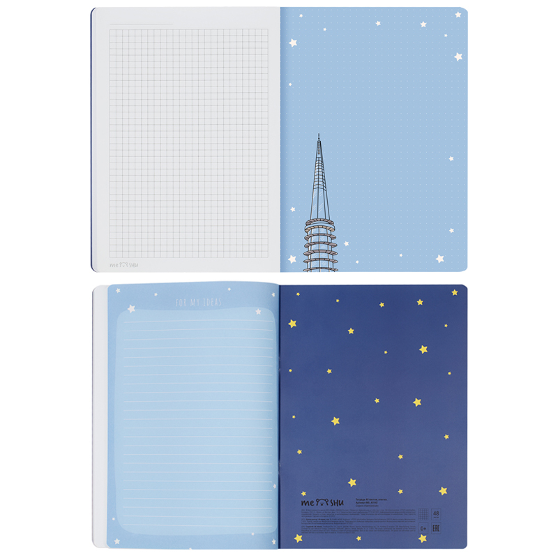 Тетрадь общая формата А5 (150*210 мм) на скобе, 48 листов. Внутренний блок – офсет 65 г/м², белизна 100%, клетка с полями. Обложка тетради из импортного целлюлозного картона выделяется милым дизайном и цветной запечаткой форзаца. Отделка обложки - матовая ламинация, выборочный УФ-лак. Подкладные листы, на которых удобно записывать важные заметки, являются логичным продолжением общего дизайна тетради.