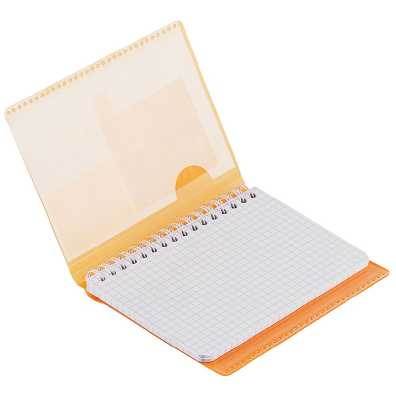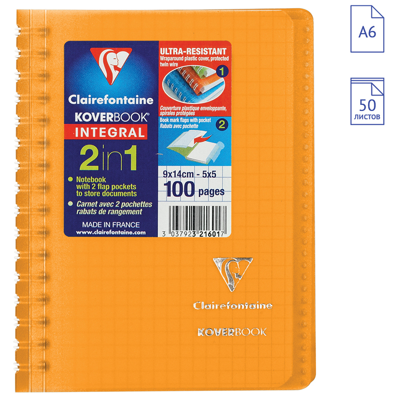 Записная книжка Clairefontaine Koverbook формата А6 имеет пластиковую обложку оранжевого цвета. Пластиковая обложка имеет две дополнительные откидные створки с внутренней стороны, которые служат карманом для документов или визиток, закладкой или разделителем для записей. Внутренний блок изделия выполнен из высококачественной белой бумаги Clairefontaine плотностью 90 г/м2 с печатью в один цвет. Листы скреплены гребнем, который защищает обложка. Записная книжка Clairefontaine Koverbook компактна – её размер 90*140 мм, благодаря чему изделие удобно всегда носить с собой. <br/>• Формат: A6;<br/>• Количество листов: 50;<br/>• Материал обложки: пластик;<br/>• Цвет обложки: оранжевый.