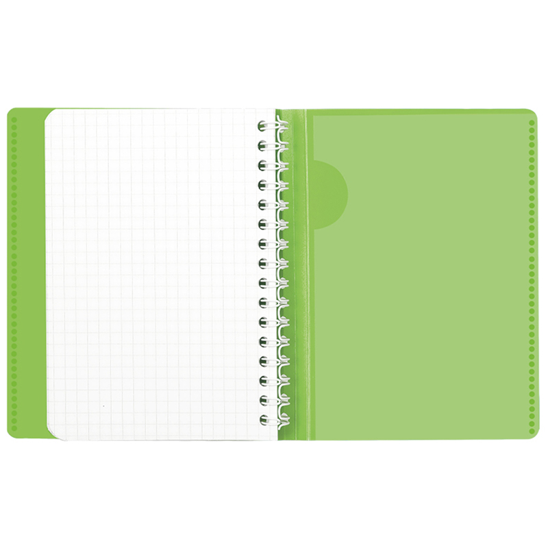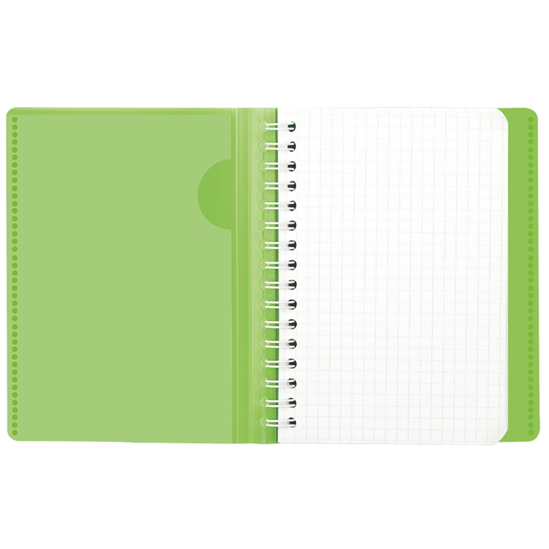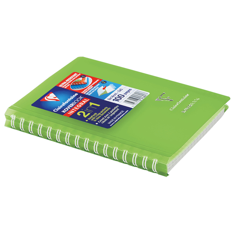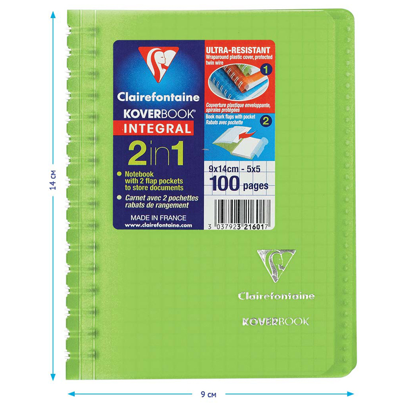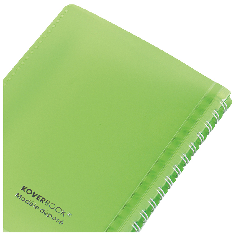 Записная книжка Clairefontaine Koverbook формата А6 имеет пластиковую обложку зелёного цвета. Пластиковая обложка имеет две дополнительные откидные створки с внутренней стороны, которые служат карманом для документов или визиток, закладкой или разделителем для записей. Внутренний блок изделия выполнен из высококачественной белой бумаги Clairefontaine плотностью 90 г/м2 с печатью в один цвет. Листы скреплены гребнем, который защищает обложка. Записная книжка Clairefontaine Koverbook компактна – её размер 90*140 мм, благодаря чему изделие удобно всегда носить с собой.