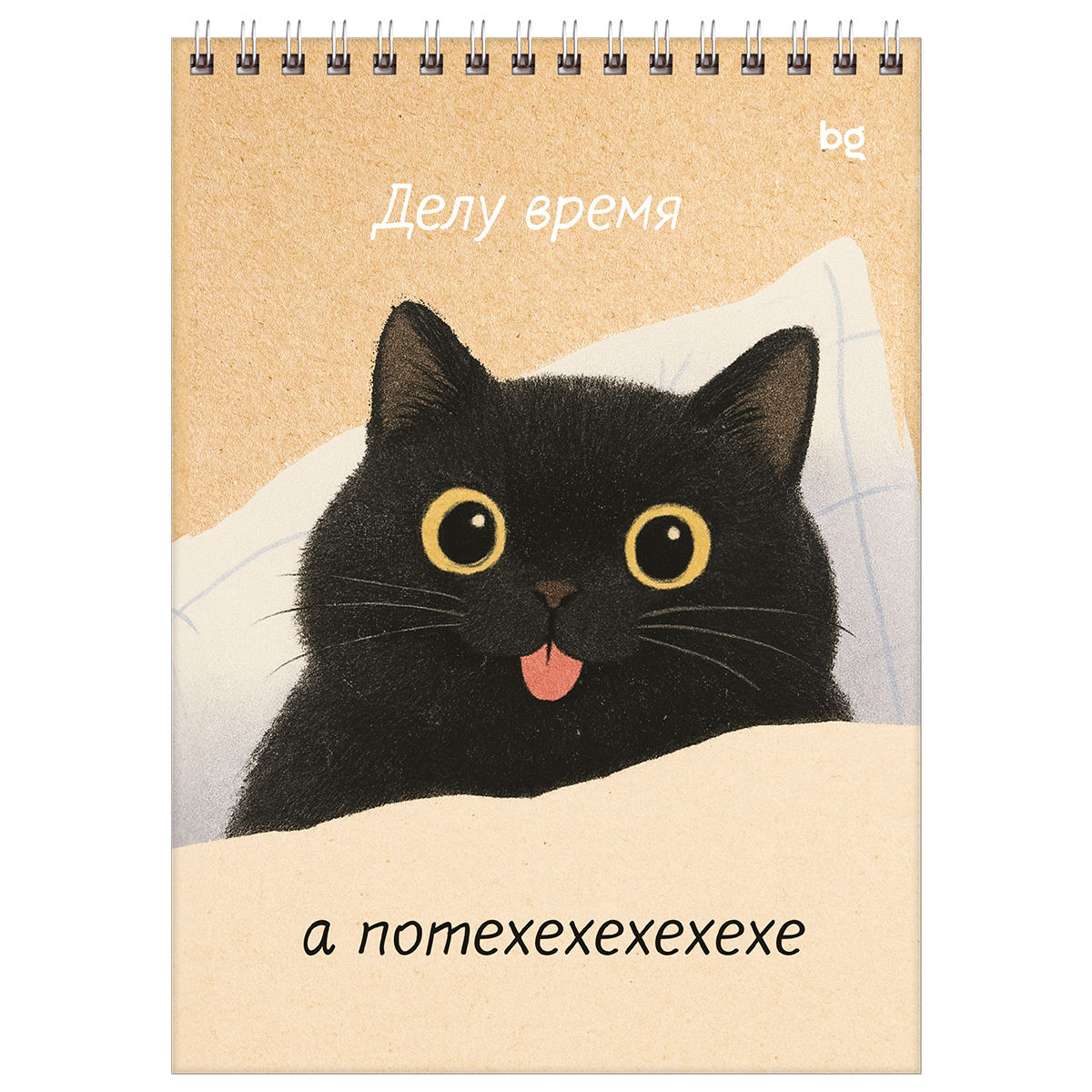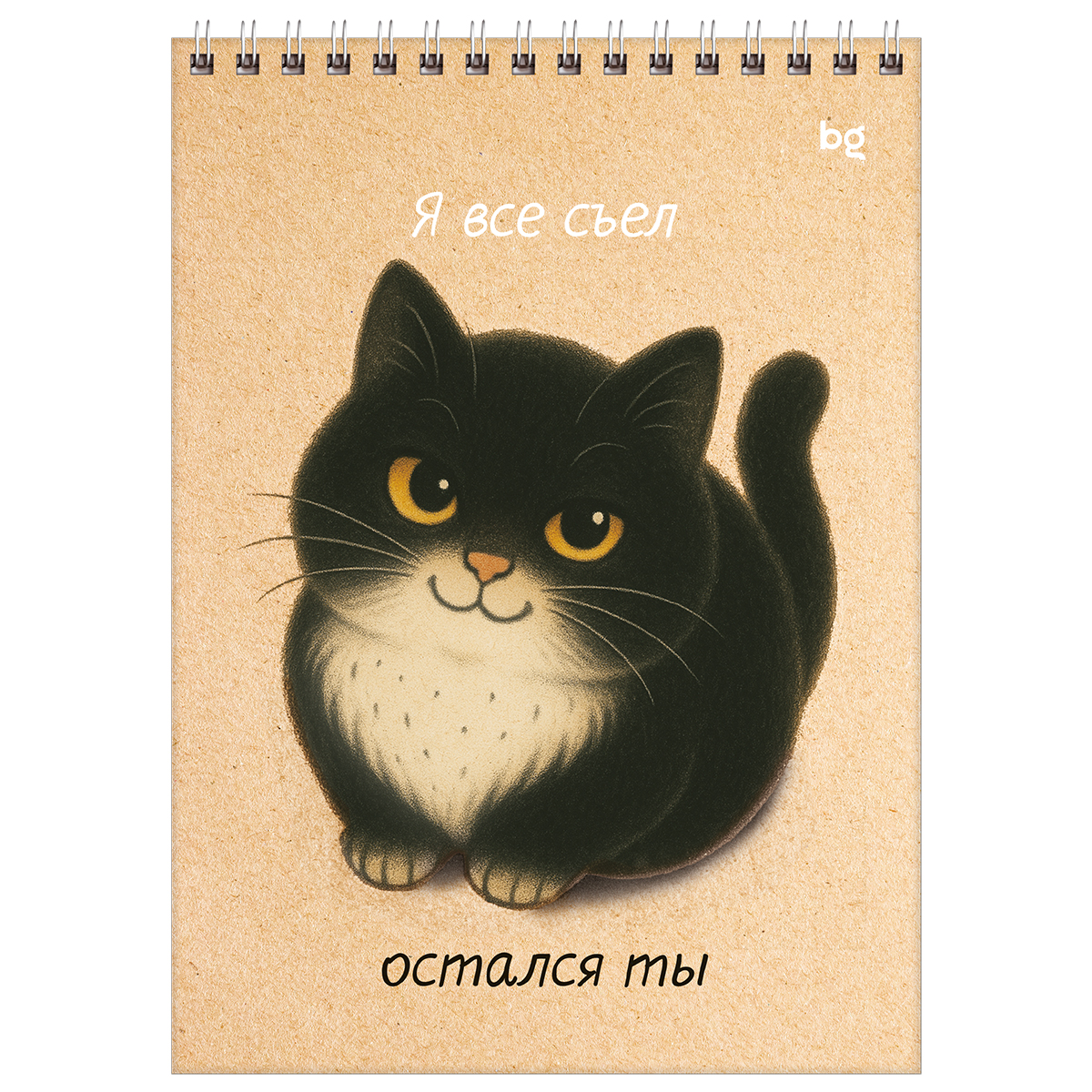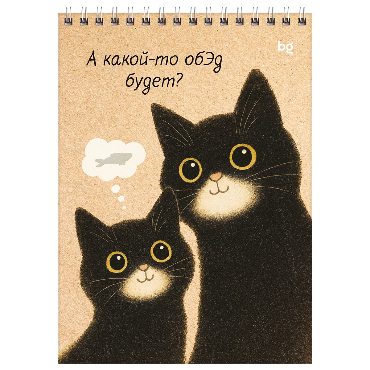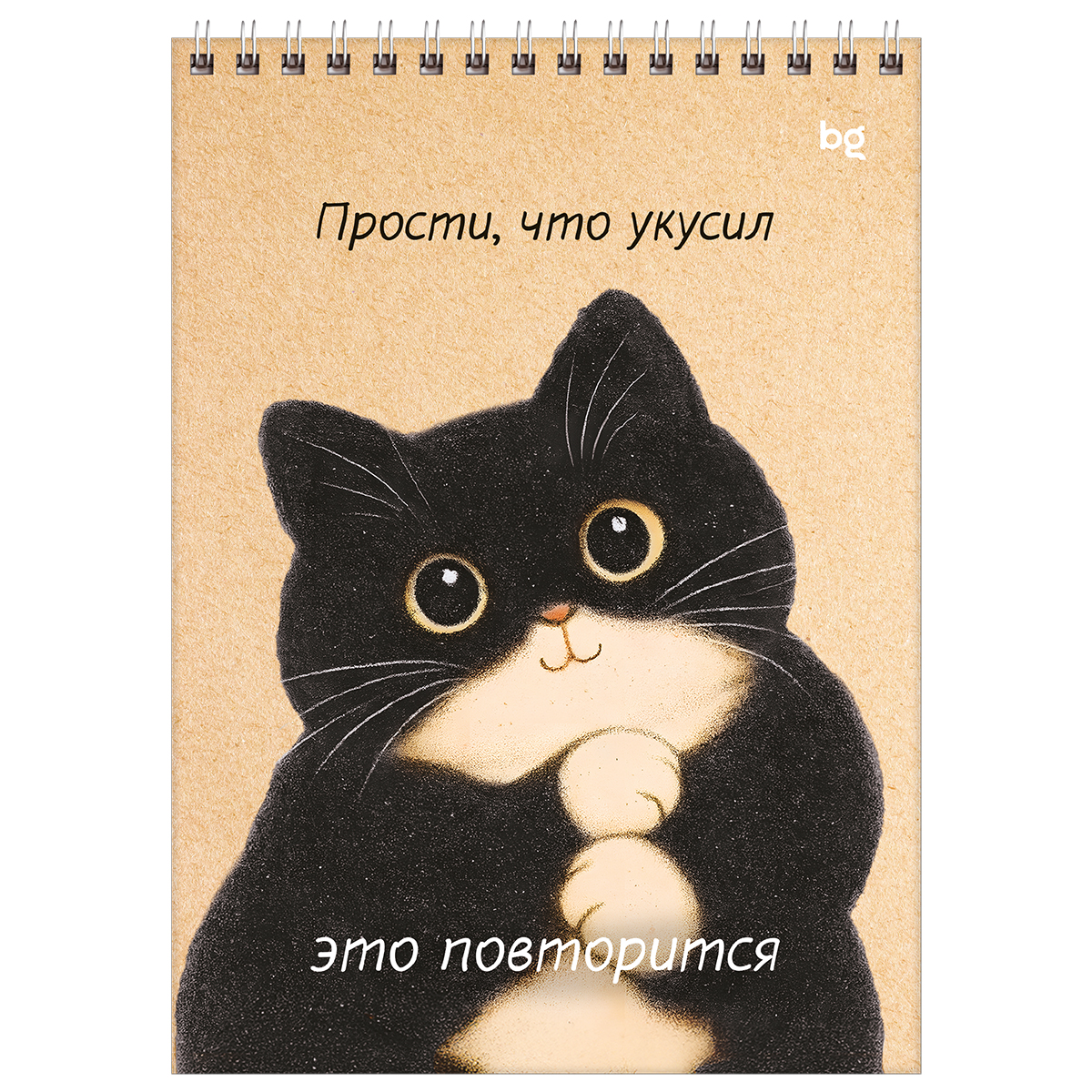 Блокнот BG "Настроение - кот" формата А5 прекрасно подойдёт для записей и заметок.<br/>Состоит из 60 листов размером 148*200 мм офсетной бумаги белого цвета плотностью 60 г/м2. Линовка – клетка. Обложка – мелованный картон. Гребень позволяет легко вынимать листы при необходимости.<br/>• формат: А5 (148*200 мм);<br/>• кол-во листов: 60;<br/>• линовка: клетка;<br/>• вид скрепления: гребень/спираль;<br/>• материал обложки: картон.