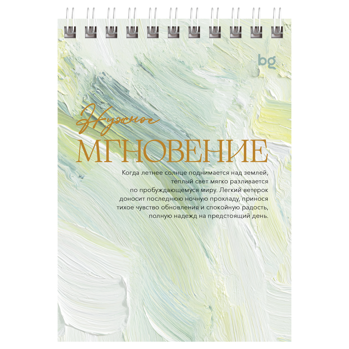 Блокнот BG «Видеть прекрасное» формата А6 с линовкой в клетку предназначен для быстрых заметок на ходу. Миниатюрное изделие подходит тем, кто хочет постоянно носить инструмент для записей с собой. Размер блокнота — 105*145 мм. Переплёт на гребне позволяет раскрывать блокнот на 360 градусов: его легко перелистывать и открывать в нужном месте. При необходимости лист всегда можно вырвать. Внутренний блок состоит из 80 листов офсетной бумаги плотностью 60 г/кв.м. Обложка сделана из мелованного картона.<br/>• Формат: А6 (105*145 мм);<br/>• Количество листов: 80;<br/>• Линовка: клетка;<br/>• Вид скрепления: гребень/спираль;<br/>• Материал обложки: картон.