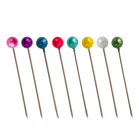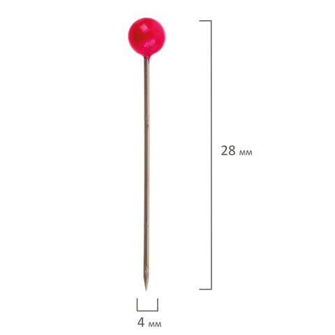 Булавки размером 28 мм изготовлены из металла и имеют цветную пластиковую шляпку. 150 штук в картонной упаковке.