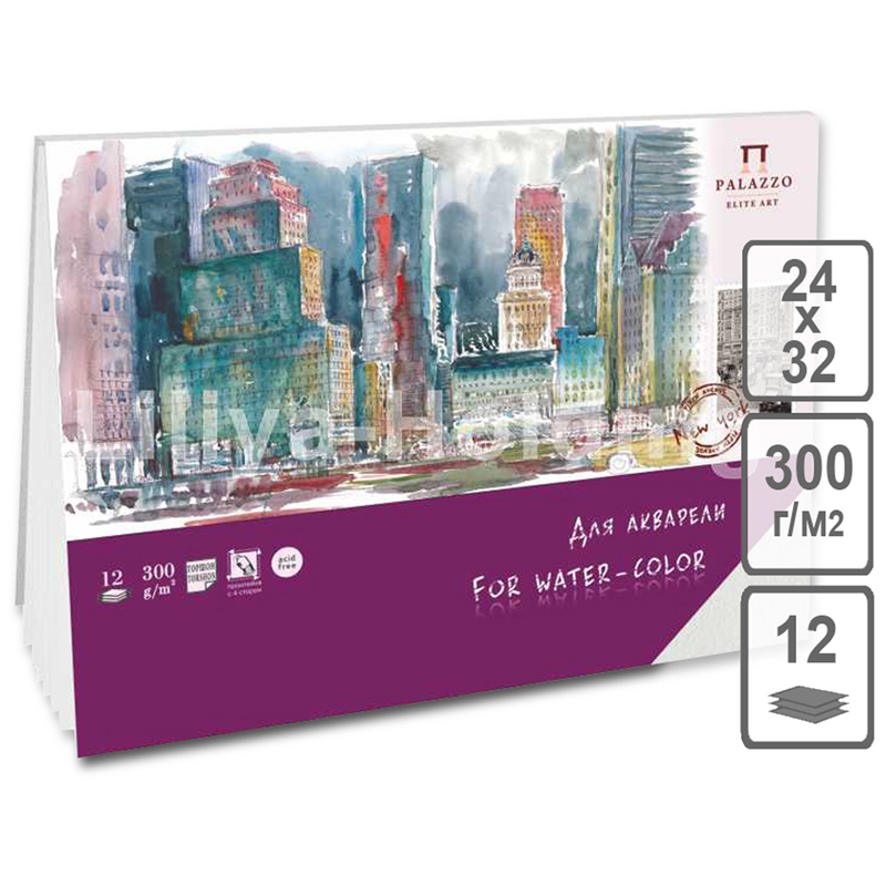 Альбом для акварели на склейке (по 4-м сторонам) с бумагой торшон плотностью 300 г/м2. Торшон наиболее часто используется для рисования пейзажей. Бумага имеет грубую выраженную фактуру и идеально белоснежный цвет, так как во время производства её высушивают без дальнейшего отжатия. Торшон выбирают те, кто предпочитает экспрессивную фактуру, мазки, сухую кисть, выскребание и проскальзывание. Плотность позволяет бумаге быть устойчивой к смыванию жесткими кистями.