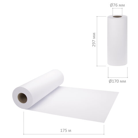 Бумага имеет оптимальную для печати плотность 80 г/м2, подходящую для большинства задач. Высокая степень белизны позволяет добиться более контрастного изображения при печати. Рулон имеет размер 297 мм, что соответствует формату А3. Длина рулона - 175 м, внутренний диаметр втулки - 76 мм.