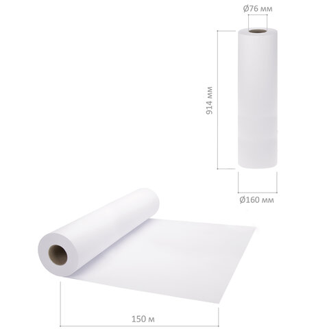 Бумага имеет оптимальную для печати плотность 80 г/м2, подходящую для большинства задач. Высокая степень белизны позволяет добиться более контрастного изображения при печати. Рулон имеет размер 914 мм, что соответствует формату А0+. Длина рулона - 150 м, внутренний диаметр втулки - 76 мм.