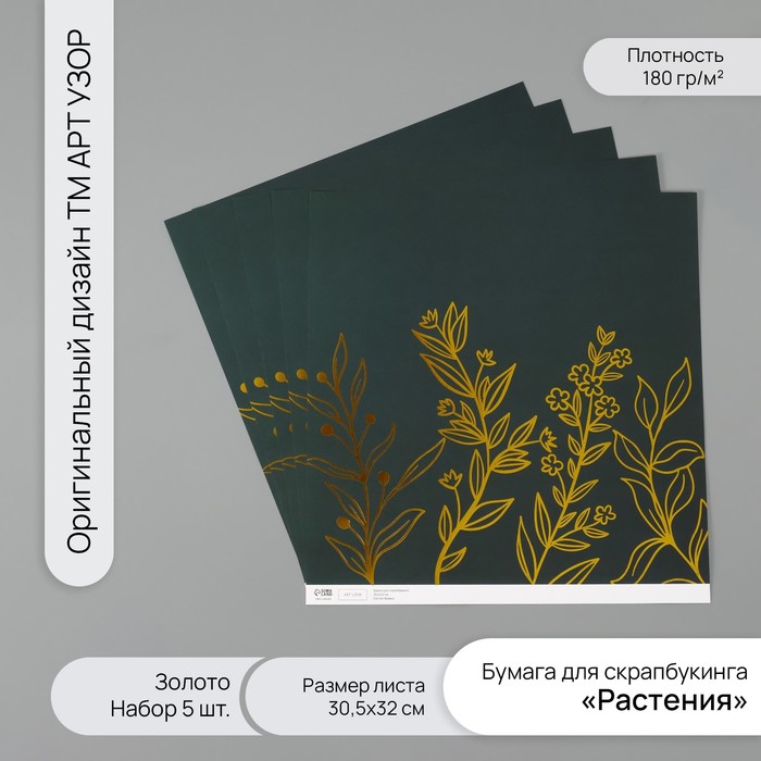 Бумага для скрапбукинга золото "Растения" плотность 180 гр набор 5 шт 30,5х32 см