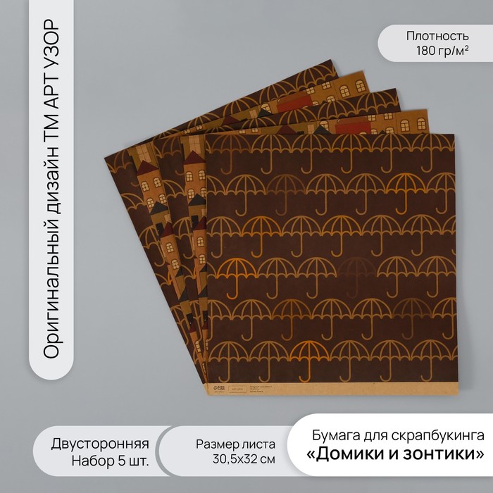 Бумага для скрапбукинга двусторонняя крафт "Домики и зонтики" плотность 180 гр набор 5 шт 30,5х32 см