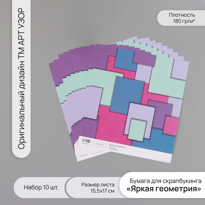 Бумага для скрапбукинга "Яркая геометрия" плотность 180 гр набор 10 шт 15,5х17 см