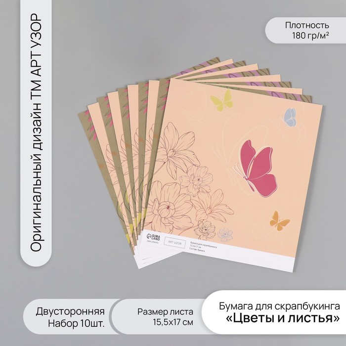 Бумага для скрапбукинга двусторонняя "Цветы и листья" плотность 180 гр набор 10 шт 15,5х17 см 1071