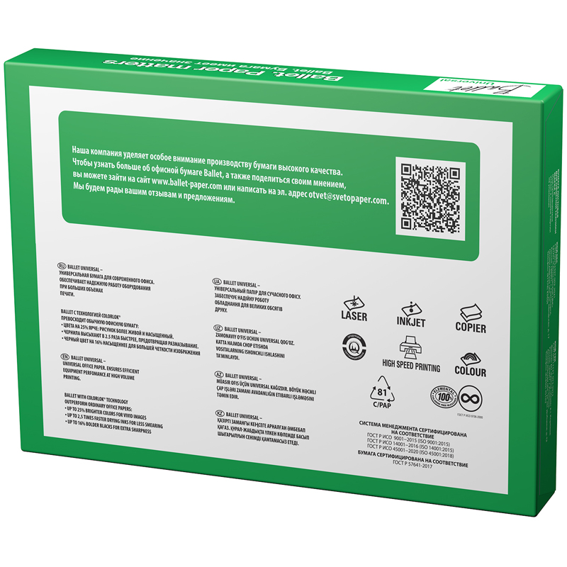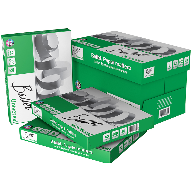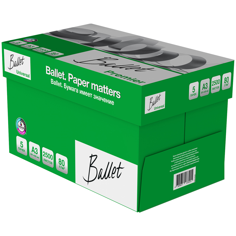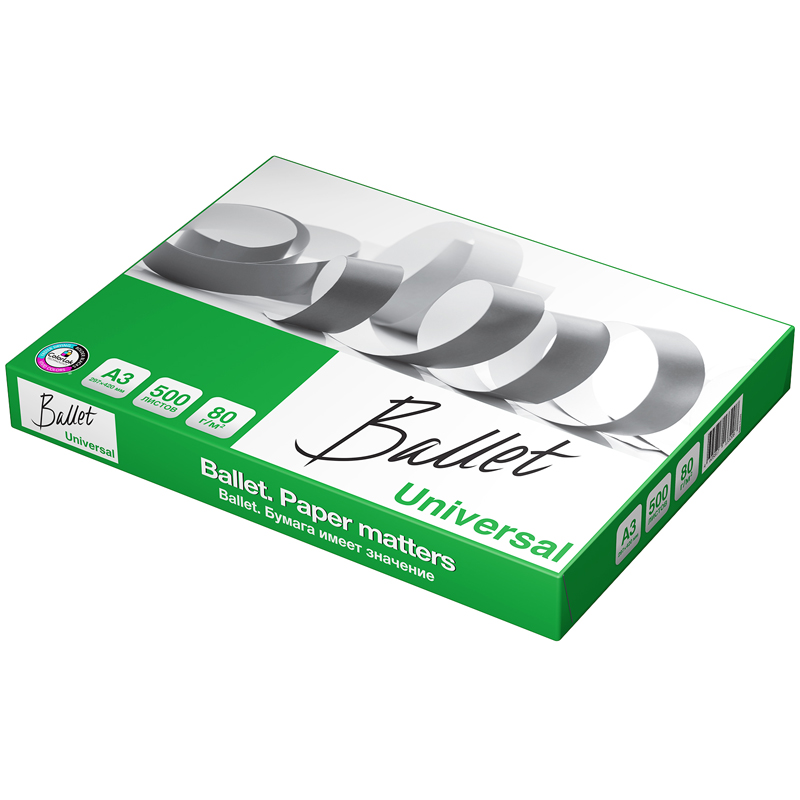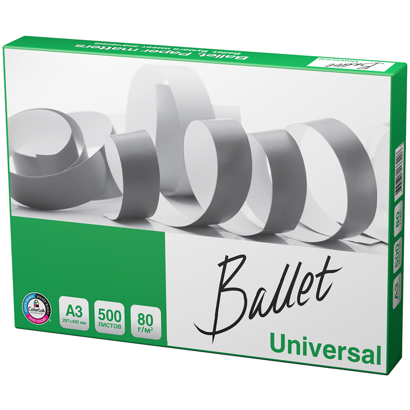 Ballet Universal - Бумага марки «С» в соответствии с ГОСТ Р 57641-2017 для повседневной печати и копирования в больших объемах. Отвечает на все запросы современного офиса и обеспечивает бесперебойную работу офисного оборудования. Плотность 80 г/м2; яркость 105%, ISO; белизна 146 по CIE. Производится с технологией ColorLok. Страна-производитель Россия.
