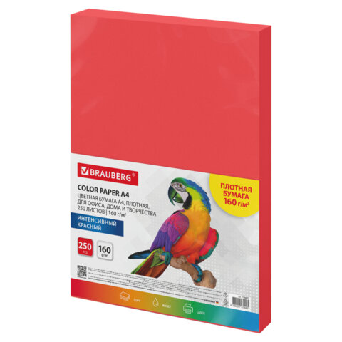 Упакована в пачку из 250 листов формата А4. В упаковке бумага интенсивного тона красного цвета. Листы бумаги с повышенной плотностью 160 г/м2 подходят для офисной техники.