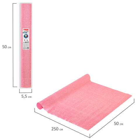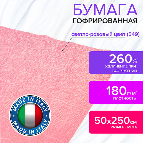 Гофрированная бумага представляет собой бумажную продукцию с неровной, складчатой поверхностью. Размер бумаги 50х250 см, плотность – 180 г/м2, удлинение при натяжении – 260%. Цвет - Светло-розовый (549).