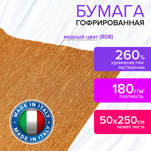 Гофрированная бумага представляет собой бумажную продукцию с неровной, складчатой поверхностью. Размер бумаги 50х250 см, плотность – 180 г/м2, удлинение при натяжении – 260%. Цвет - Mедный (808).