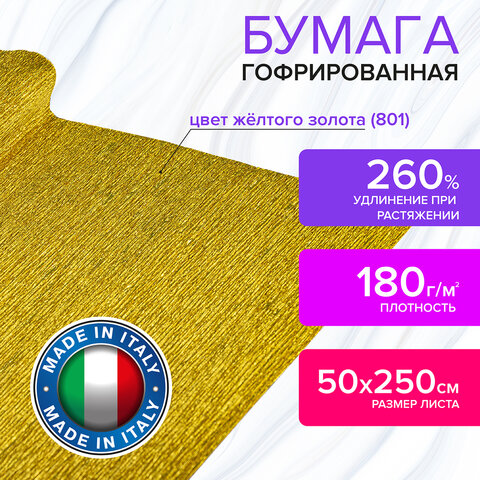 Гофрированная бумага представляет собой бумажную продукцию с неровной, складчатой поверхностью. Размер бумаги 50х250 см, плотность – 180 г/м2, удлинение при натяжении – 260%. Цвет - Желтое золото (801).