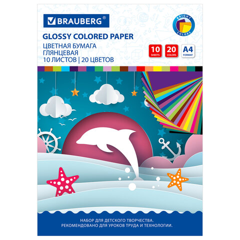 Набор мелованной (глянцевой) двусторонней цветной бумаги плотностью 80 г/м2 включает 10 листов формата А4 (200х280 мм) в 20-ти разнообразных и насыщенных однородных цветах. Листы упакованы в картонную папку, легко режутся и сгибаются.
