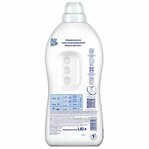 Кондиционер для белья Вернель Детский придает белью нейтральный аромат и подходит для стирки детского белья с первых дней жизни ребенка (0+). Продукт дерматологически протестирован и одобрен Союзом Педиатров России. Не содержит красителей. Также Вернель Детский придает белью невероятную мягкость, делая его приятным на ощупь. Гладить белье становится намного легче, а сохнет оно намного быстрее. Средство также обладает антистатическим эффектом. Благодаря удобной крышке-дозатору Вы всегда будете знать, сколько средства необходимо добавить. Концентрированного средства хватает на длительное время.
