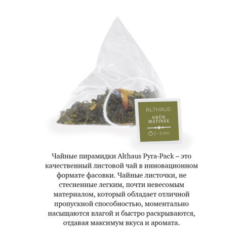 Каждая пирамидка упакована в четырехслойный конверт, который состоит из белой бумаги с названием и фирменным логотипом, полиэтилена пониженной плотности, алюминиевой фольги и полипропилена, что исключает потерю первоначального вкуса и аромата чая в процессе транспортировки и хранения.