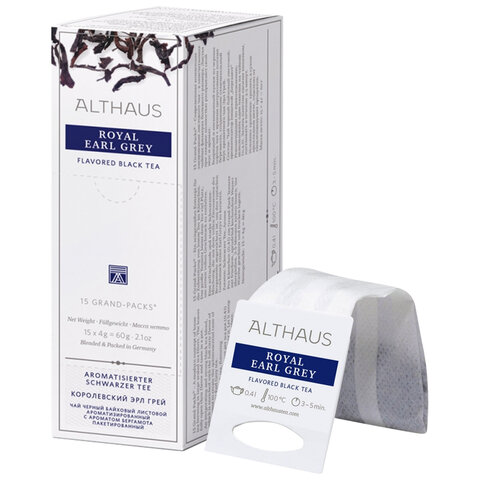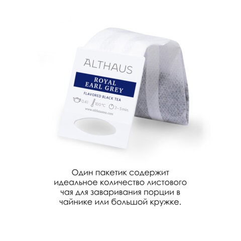 В упаковке находятся 15 продолговатых мешочков из специальной целлюлозы с длинными волокнами (Grand Pack), которые имеют продолжение в виде квадратной картонной этикетки. Такая форма создана для заваривания в чайниках объемом 300–400 мл.