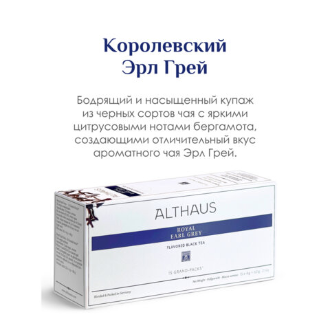 "Royal Earl Grey" – очень ароматный, бодрящий и насыщенный купаж из черных сортов чая сертифицированного органического происхождения с яркими цитрусовыми нотами бергамота.