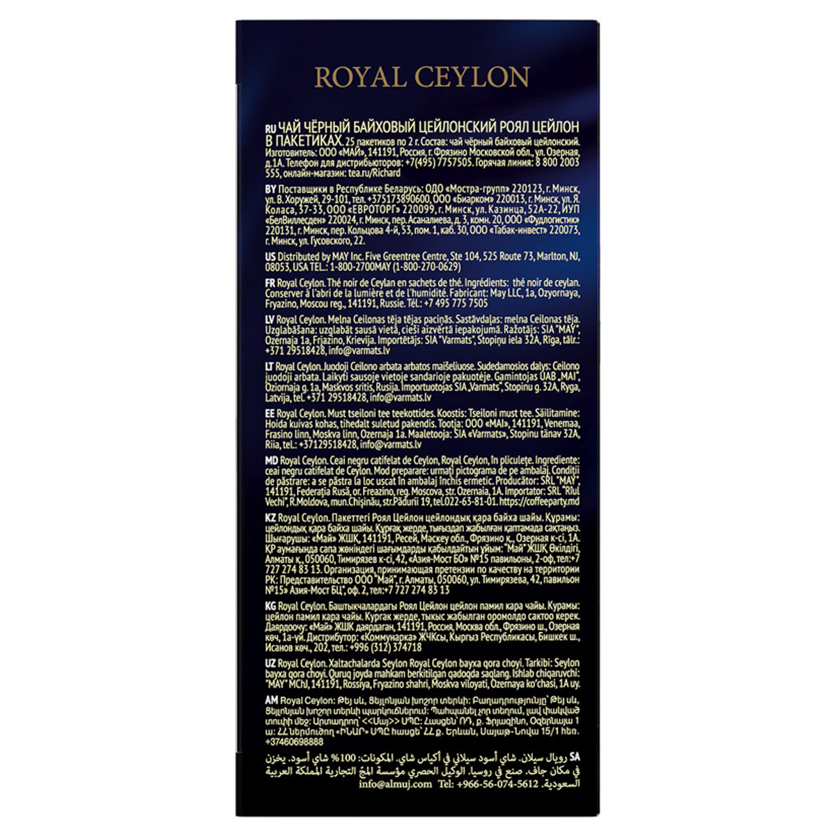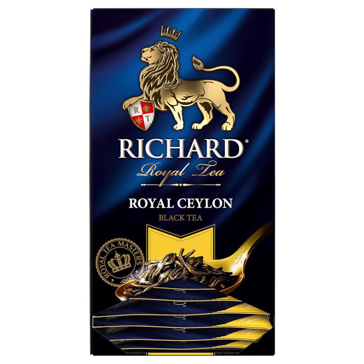 Чай Richard "Royal Ceylon" черный 25 сашет <br/>Бесценный шедевр Королевской чайной коллекции, блистательный купаж Richard Royal Ceylon хранит верность тонкому вкусу коронованных особ.<br/>Отборный цейлонский чай с мягкими, едва уловимыми сладковатыми нотками - неизменный выбор королей!<br/>Попробуйте! По рецептам королевского двора Richard Royal English Breakfast <br/>Особенности состава: 100% Цейлонский чай <br/>Форма выпуска: Individual sachets <br/>Вкус продукта: Классический<br/>Свойства продукта: Бодрящий<br/>Сорт продукта: Высший