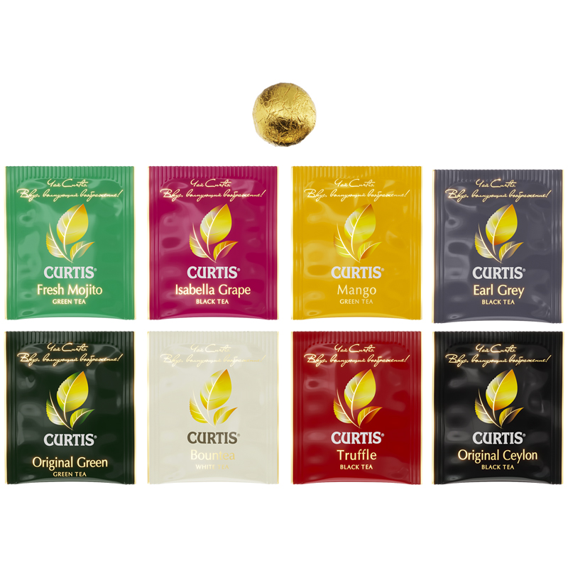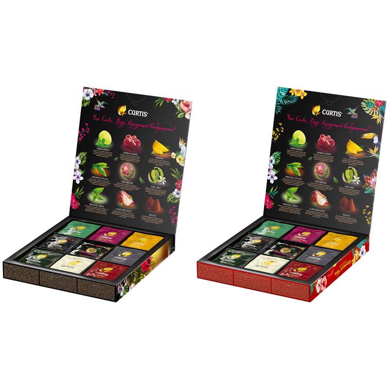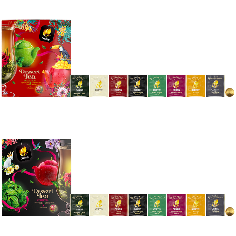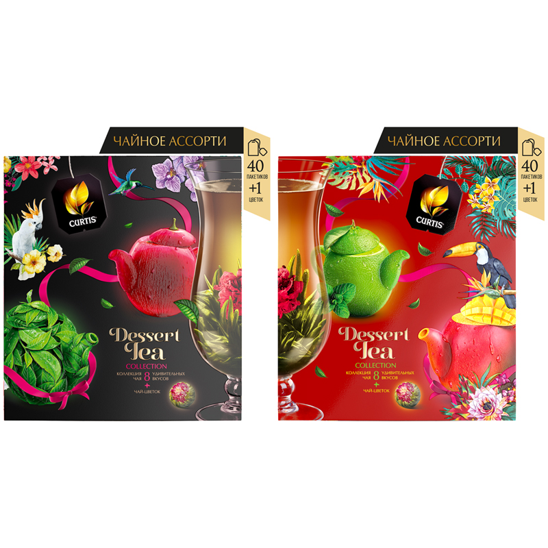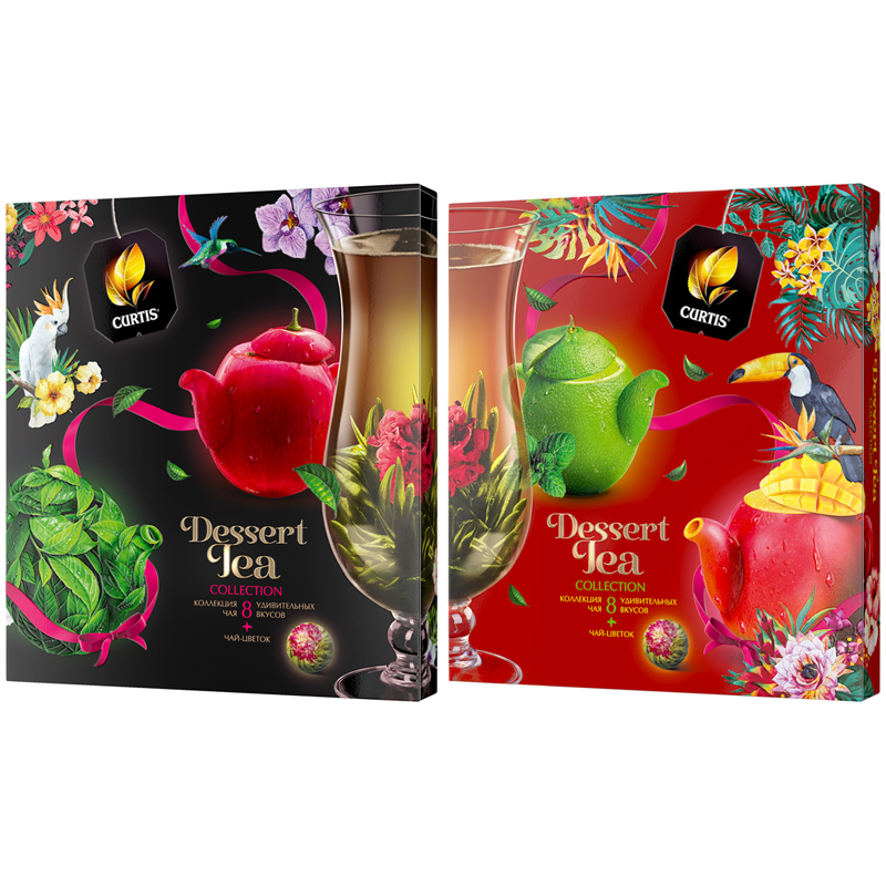 Curtis "Dessert Tea Collection + Blooming" - aссорти из 8 видов черного, зеленого и белого ароматизированного чая в сашетах в подарочной коробке. Дополнение к набору - нежный цветок, спрятанный в ароматных чайных листьях, дарящий незабываемый изысканный вкус.
