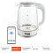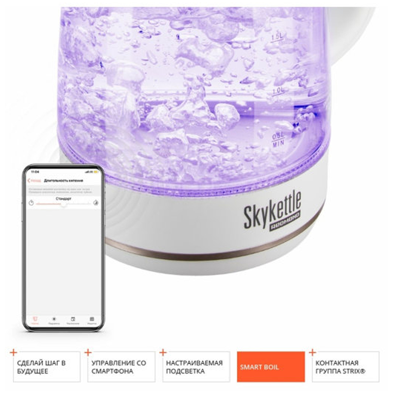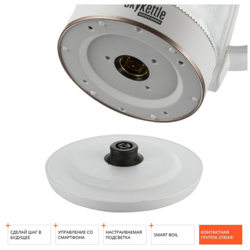 REDMOND SkyKettle G203S – это умный чайник-светильник с дистанционным управлением. Установите на свой смартфон приложение Ready for Sky, и вы сможете включать чайник и подогревать воду для приготовления любимого напитка, находясь в соседней комнате или даже на улице.<br/>Проснувшись, запускайте кипячение в 1 клик, не вставая с постели. Когда вы придете на кухню, чайник уже нагреет воду для утреннего чая или кофе.<br/>В приложении можно посмотреть, какой температуры вода в чайнике сейчас, а также выбрать любую температуру нагрева с точностью до 1°C. Чтобы приготовить детскую смесь, вам не придется кипятить воду и долго остужать ее. Задайте настройки в приложении, и SkyKettle быстро нагреет воду точно до 40°C.<br/>В специальном разделе приложения вы найдете множество рецептов классического черного, зеленого и других видов чая, а также детского питания и простых блюд. Запустите нагрев воды для бодрящего цитрусового или нежного ванильного чая из приложения в 1 клик. G203S автоматически нагреет воду до оптимальной температуры, которая позволит раскрыть тонкий вкус и аромат разных сортов чая.<br/>Для максимального удобства в приложении предусмотрена функция «Расписание». Установите дату, точное время и периодичность нагрева, и SkyKettle самостоятельно подогреет воду точно к завтраку, ужину или ко времени кормления ребенка.<br/>С помощью функции Smart Boil в приложении вы можете самостоятельно контролировать продолжительность кипячения. Например, водопроводная вода может быть загрязнена бактериями. И если для приготовления напитков и блюд вы кипятите водопроводную воду, то интенсивное кипячение позволит очистить ее от вредных примесей.<br/>Для бутилированной воды установите неактивное кипячение, так вода сохранит исходную минерализацию и большинство полезных веществ.<br/>Благодаря светодиодной подсветке чайник можно использовать как декоративный элемент интерьера кухни. Установите в приложении цвет и яркость освещения, и выберите скорость переключения между цветами.<br/>Включите режим «Ночник», и SkyKettle будет переливаться и освещать комнату, даже когда не кипятит воду. В режиме «Диско-чай» чайник будет светиться и сиять в такт музыке на смартфоне или любом другом музыкальном проигрывателе.