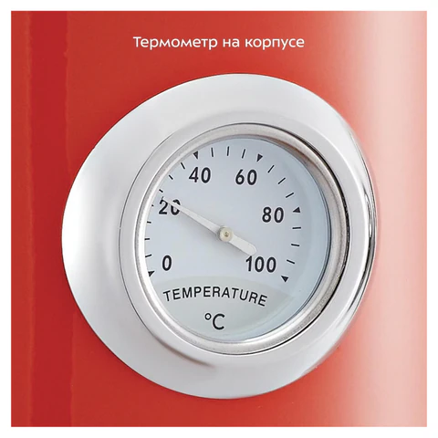 На корпусе чайника расположен термометр, который показывает температуру воды в чайнике. Это удобно, если вы готовите напитки, для которых требуется определённая температура воды. Для корректной работы термометра наполняйте чайник выше минимального уровня.