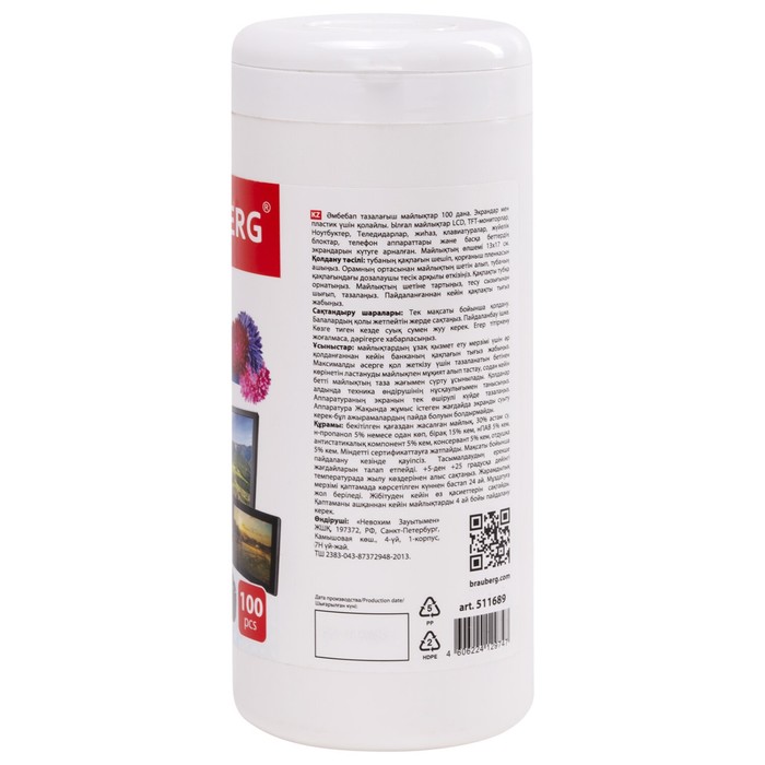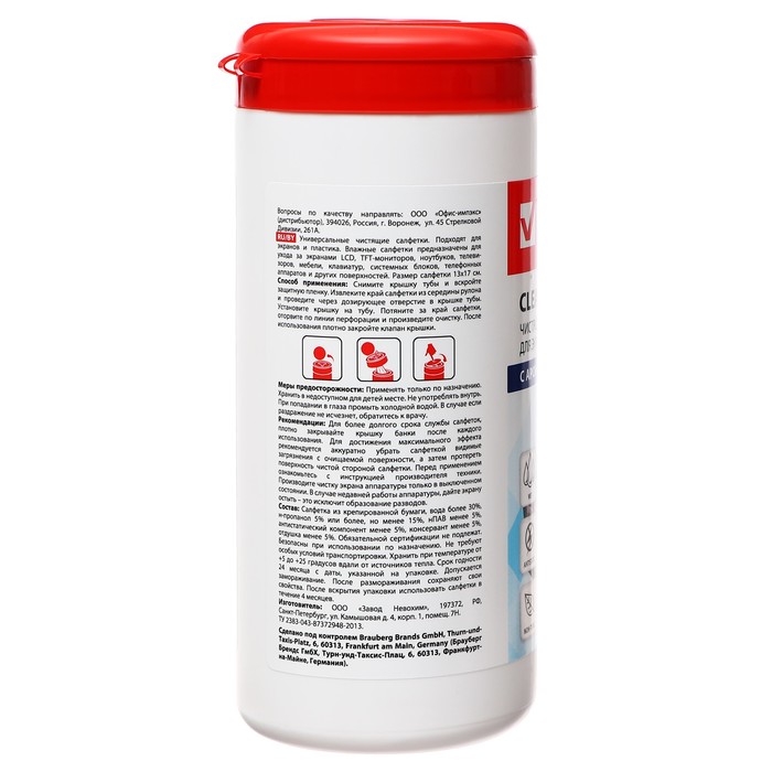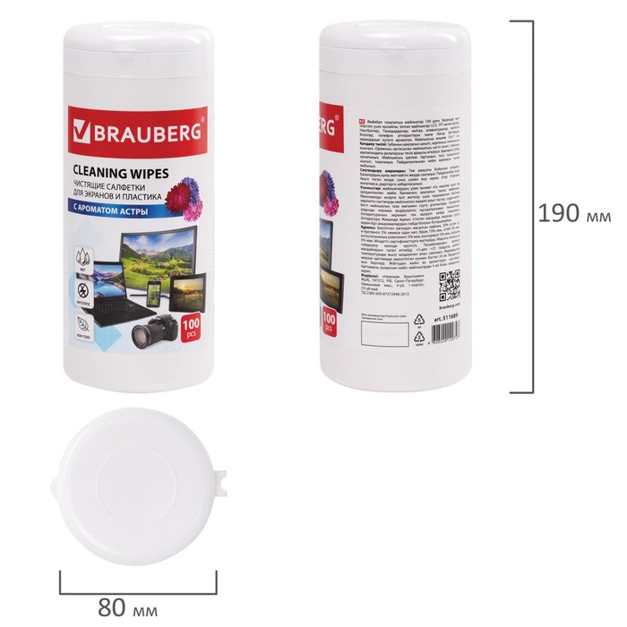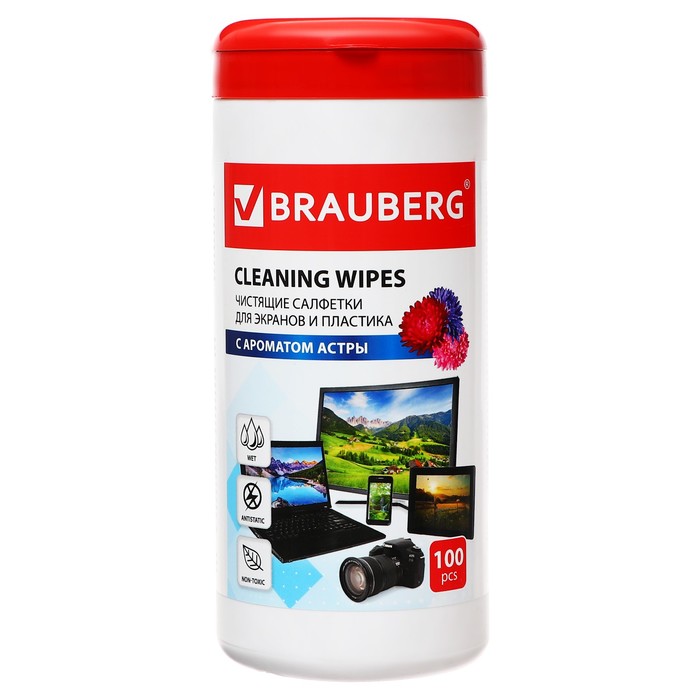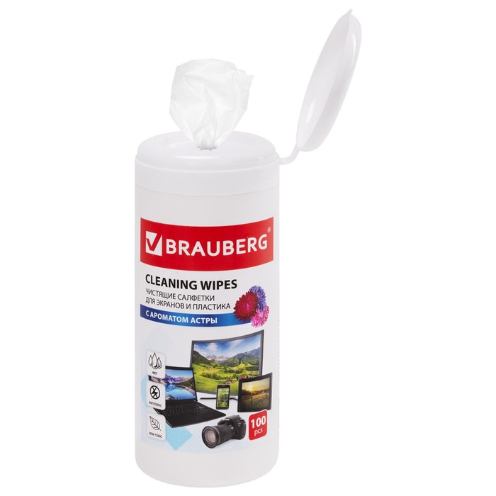 Чистящие салфетки BRAUBERG для мониторов и оптических поверхностей, влажные, в тубе 100 штук