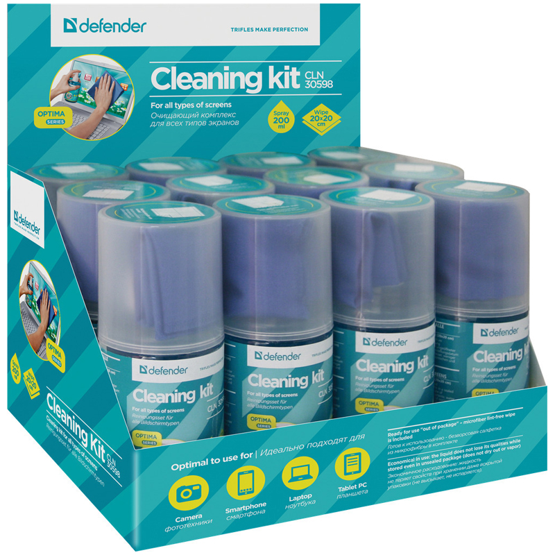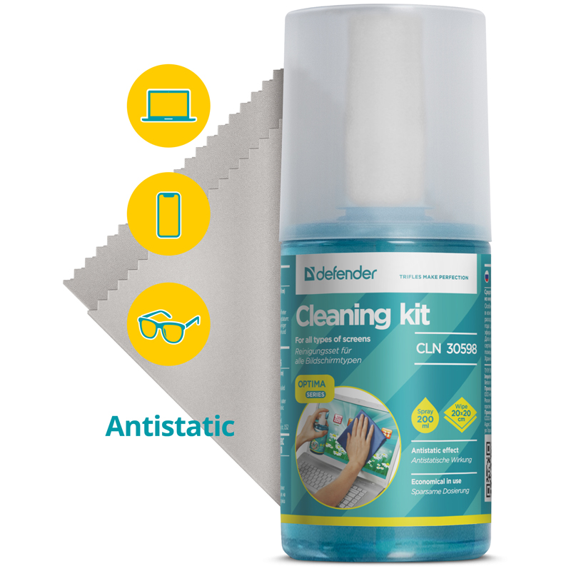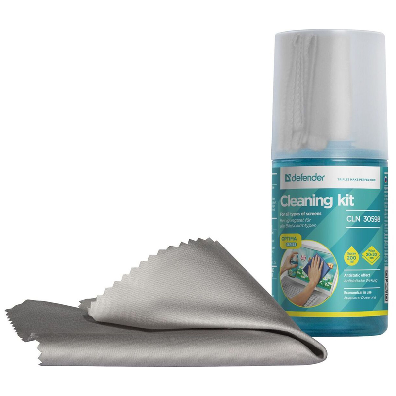 Очищающий спрей для экранов Defender CLN Optima 200мл в комплекте с салфеткой из микрофибры. Обеспечивает экономичное расходование. Подходит для экранов всех типов, стёкол, зеркал.