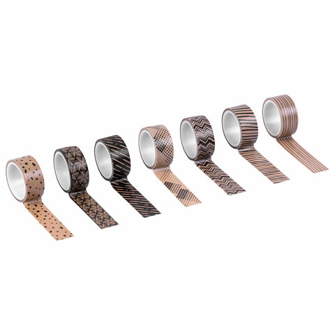 В наборе содержится 7 бумажных лент с различными дизайнами кофейных оттенков на полупрозрачной клеевой основе, каждая из которых намотана на пластиковую втулку. Ширина ленты 15 мм позволяет наклеить её даже на небольшие поделки, а длина 3 м даёт большой простор для творчества.