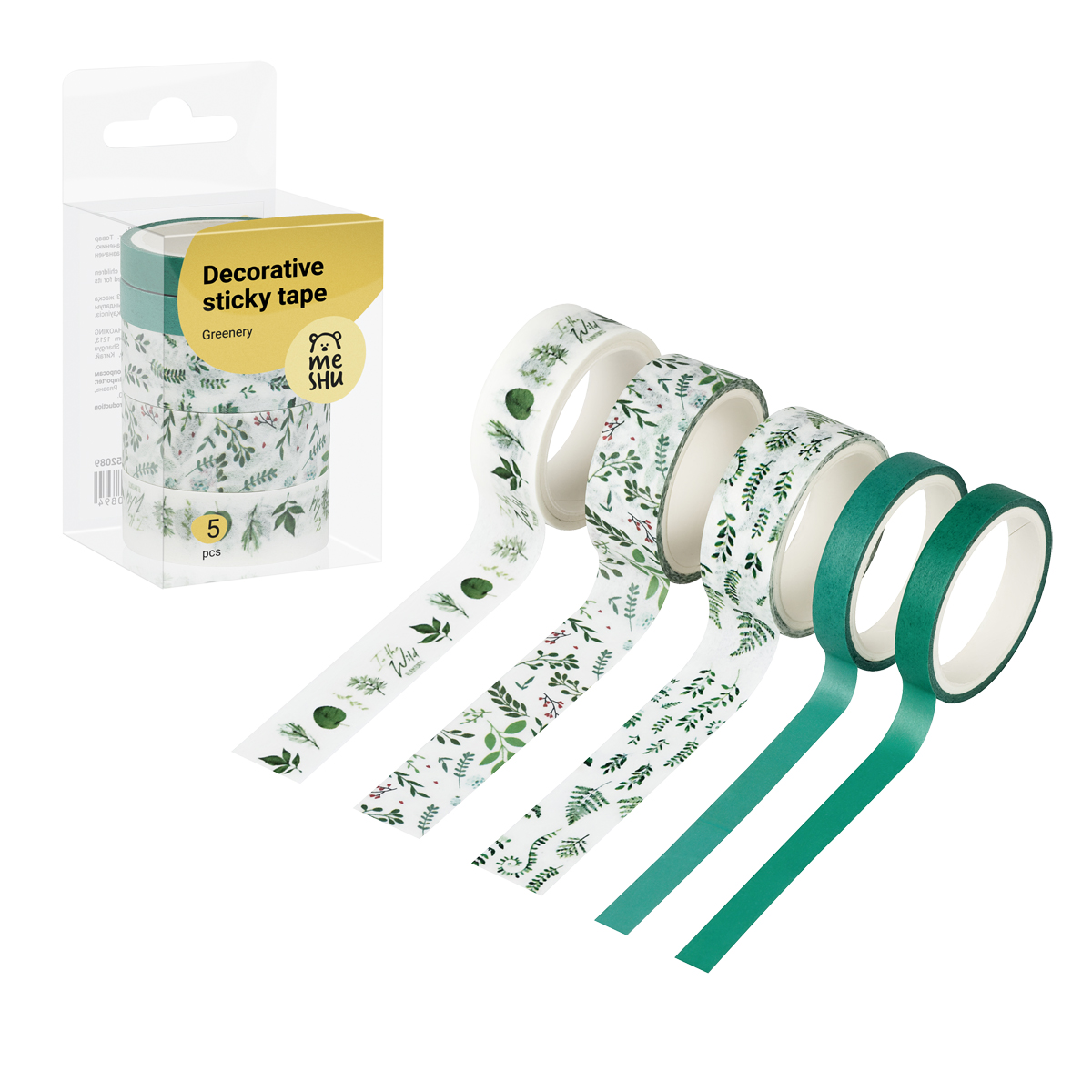 Декоративные клейкие ленты MESHU предназначены для упаковки подарков, оформления поделок, элементов интерьера и скрапбукинга. Открытки, альбомы, ежедневники, подставки, цветочные горшки, подсвечники, рамки и много другое может преобразиться с декоративными лентами MESHU. Яркие и современные дизайны сделают процесс творчества увлекательным, а результат впечатляющим. А качественная клеевая основа позволит надёжно зафиксировать ленту и быть уверенным в долговечности декора.<br/>• Ширина ленты: 15мм, 7мм;<br/>• Длина намотки: 3000 мм;<br/>• Материал: бумага;<br/>• Количество в наборе: 5.