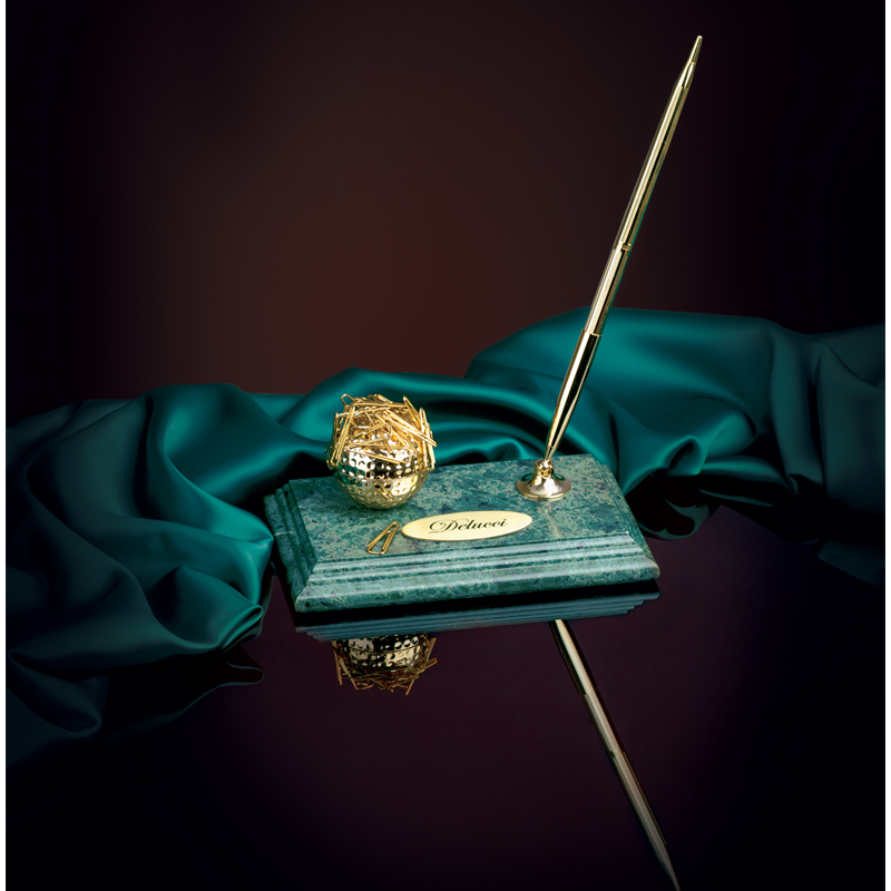 Стильная подставка под ручку с диспенсером для скрепок Delucci может стать отличным украшением рабочего стола. Корпус выполнен из мрамора красивого зелёного цвета, а фурнитура – из прочного металла. Магнитный диспенсер сделан в виде мяча для гольфа. В комплекте есть шариковая ручка с синими чернилами и скрепки. Подставка Delucci упакована в аккуратную бордовую коробку.