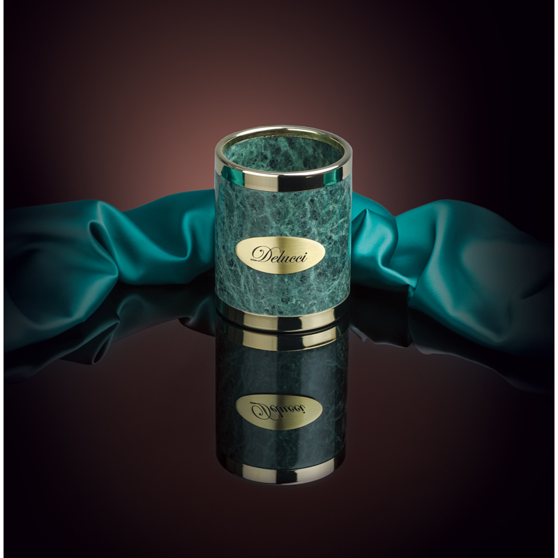 Стакан для карандашей Delucci идеально подойдёт для украшения рабочего стола руководителя. Корпус стакана диаметром 85мм выполнен в зеленом мраморе, а фурнитура – из красивого металла. Длина изделия составляет 102 мм.