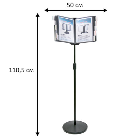 10 двухсторонних панелей серого цвета позволяют разместить одновременно до 20 листов формата А4. Панели с листовками возможно разместить как вертикально, так и горизонтально. Прочные и гибкие литые рамки панелей изготовлены из полипропилена, пригодного для повторной переработки и дальнейшего использования. Демопанели оснащены съемными ярлычками-табуляторами для маркировки и удобного поиска нужной информации. Угол наклона дисплейного модуля регулируется. Карман демопанели из прочного прозрачного материала надежно защитит документы от внешних воздействий и делает процесс чтения более комфортным. Металлическое основание имеет пластиковое покрытие для защиты от царапин. Стильный чёрный цвет металлического корпуса подойдёт для большинства современных интерьеров.