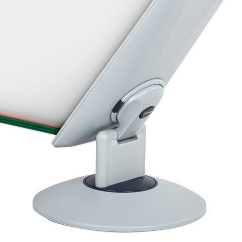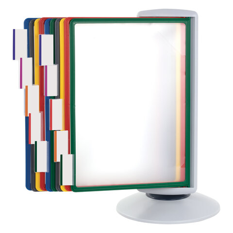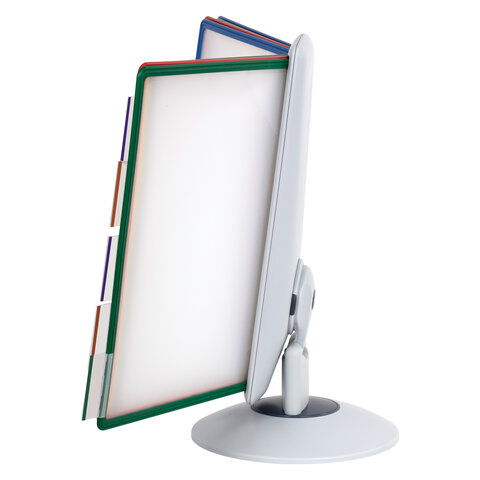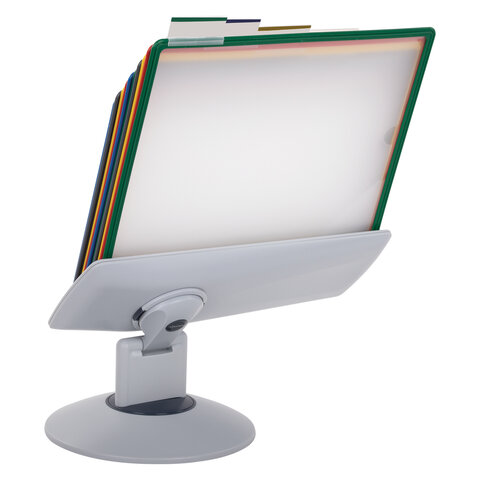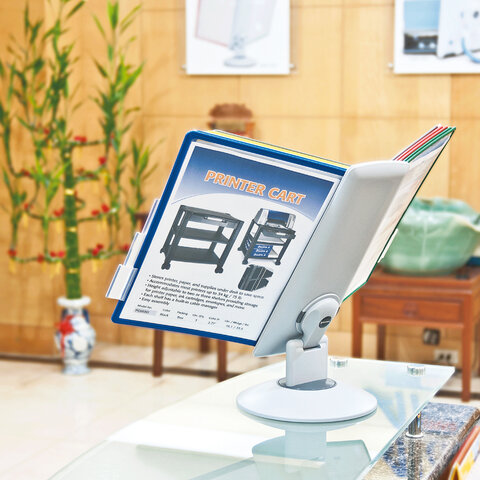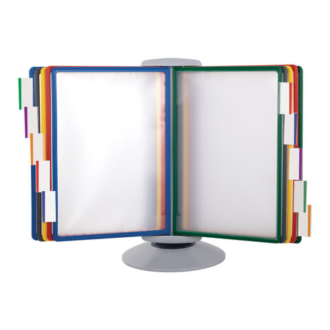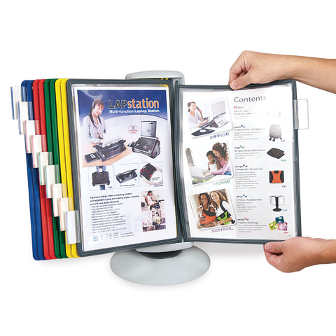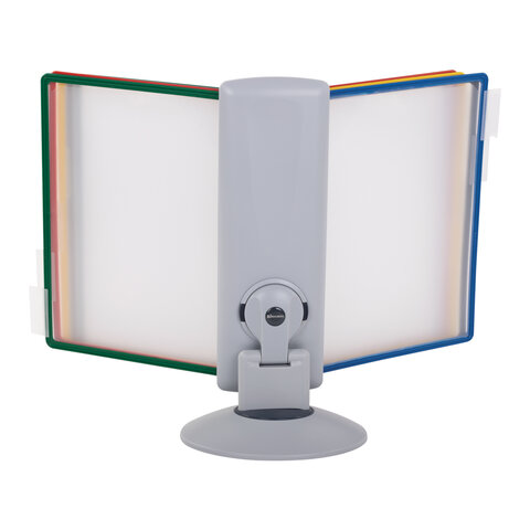 10 двухсторонних цетных панелей позволяют разместить одновременно до 20 листов формата А4. Прочные и гибкие литые рамки панелей изготовлены из полипропилена, пригодного для повторной переработки и дальнейшего использования. Демопанели оснащены съемными ярлычками-табуляторами для маркировки и удобного поиска нужной информации. Карман демопанели из прочного прозрачного материала надежно защитит документы от внешних воздействий. Устойчивое основание с вращающимся держателем панелей и поворот на 360 градусов и наклон панелей гарантируют удобство пользователю. Стильный серый цвет пластикового корпуса подойдёт для большинства современных интерьеров.