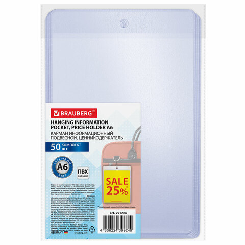 Карман информационный подвесной BRAUBERG предназначен для вертикального размещения ценников, рекламных и других информационных объявлений в магазинах и торговых залах.