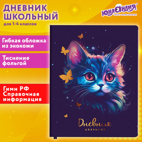 Дневник 1-4 класс 48 л., кожзам (гибкая), печать, фольга, ЮНЛАНДИЯ, "Котик", 106923