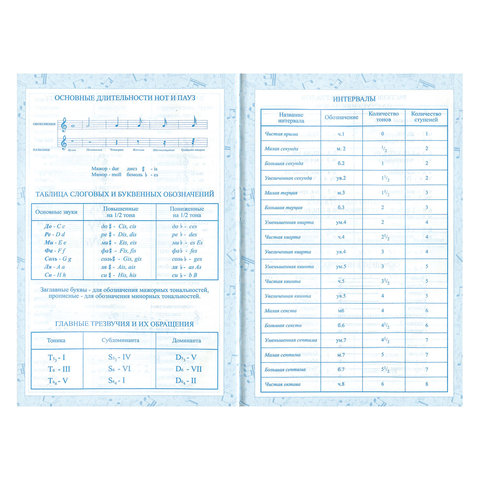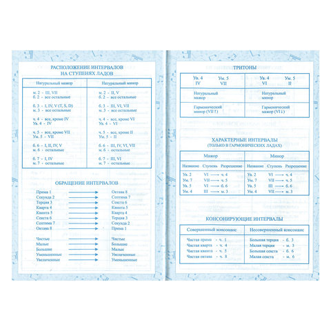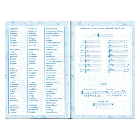 Внутренний блок изготовлен из белой офсетной бумаги плотностью 60 г/м2. Содержит 48 листов для ведения записей и справочную информацию: длительности нот, интервалы, знаки в тональностях, ключи и пр. Твердая обложка надежно защищает бумагу и долго сохраняет привлекательный внешний вид. Благодаря ламинации краски на изображении становятся более яркими и насыщенными, исключается возможное истирание рисунка. Выборочное лакирование эффектно подчеркивает отдельные элементы дизайна.