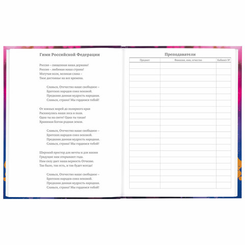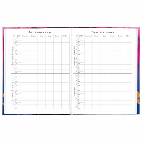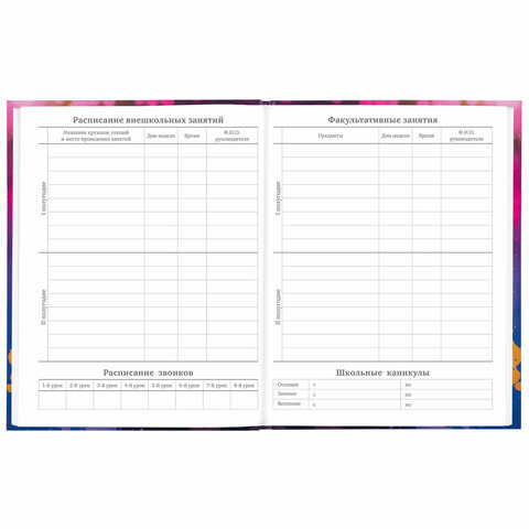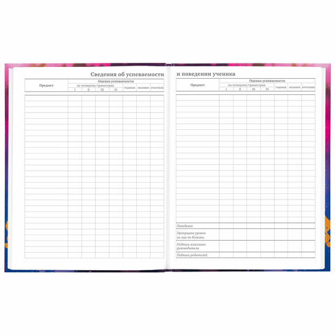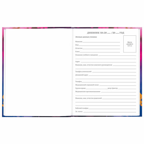 Предназначен для учащихся 5-11 классов. Твердая обложка надежно защищает бумагу и долго сохраняет привлекательный внешний вид. Благодаря глянцевой ламинации краски на изображении становятся более яркими и насыщенными, исключается возможное истирание рисунка. Внутренний блок содержит 48 листов офсетной белой бумаги плотностью 60 г/м2. Дневник снабжен полезным справочным материалом для учащихся.