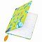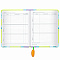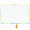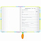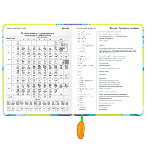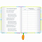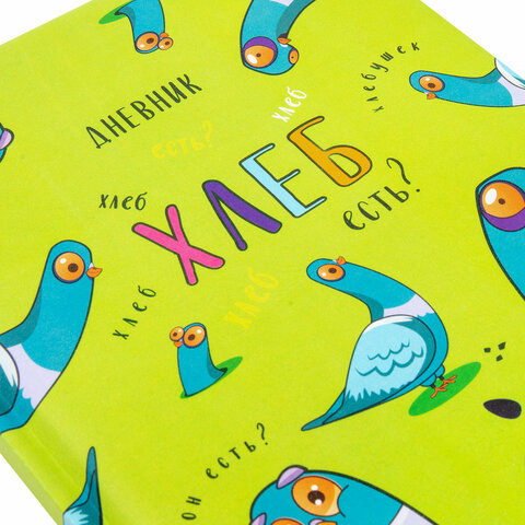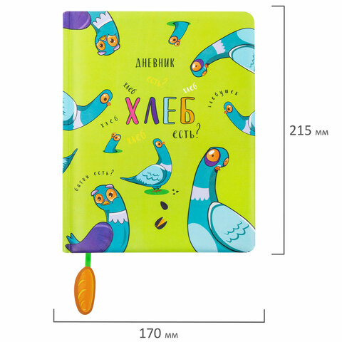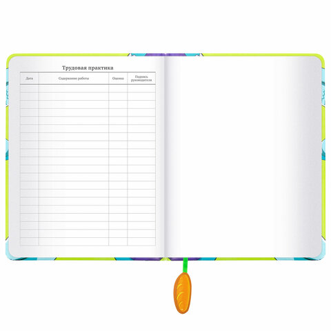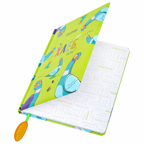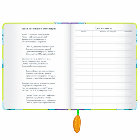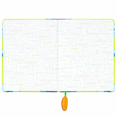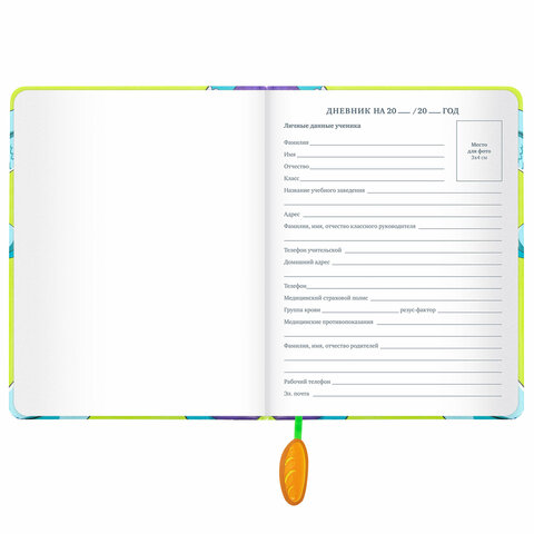 Внутренний блок содержит 48 листов и состоит из офсетной белой бумаги повышенной плотности 70 г/м2. Для удобства использования дневник снабжен закладкой-ляссе с выразительной аппликацией.