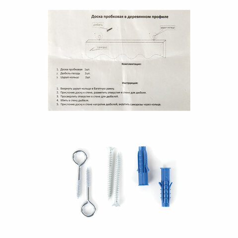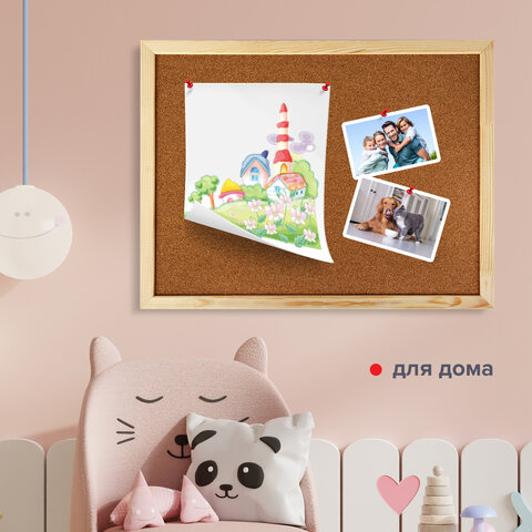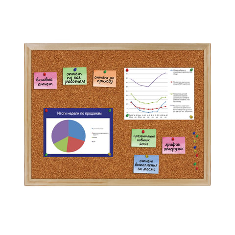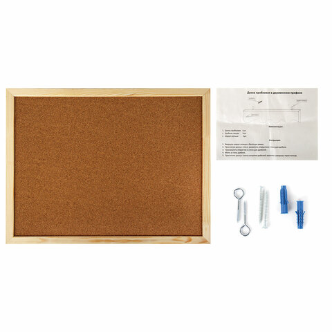Поверхность изготовлена из натуральной пробки. Имеет деревянную рамку. Размер доски - 45х60 см. Цвет покрытия: коричневый. Возможность горизонтального и вертикального размещения доски. Крепится к стене, элементы крепления входят в комплект. Гарантия 10 лет. Отверстия в пробке "закрываются" сразу же после извлечения кнопки. Таким образом, доска прослужит на протяжении долгих лет, несмотря на частое использование.