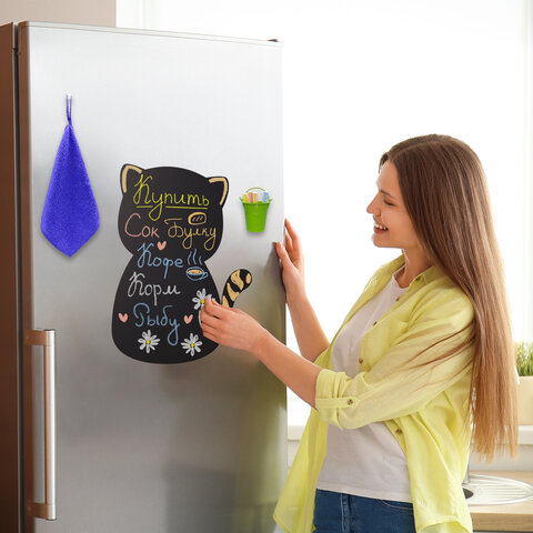Меловая доска BRAUBERG на холодильник в форме очаровательного котенка предназначена для письма мягкими мелками и сухой пастелью. Это гибкая магнитная доска, которая легко крепится к гладким металлическим поверхностям и не требует дополнительной фиксации.