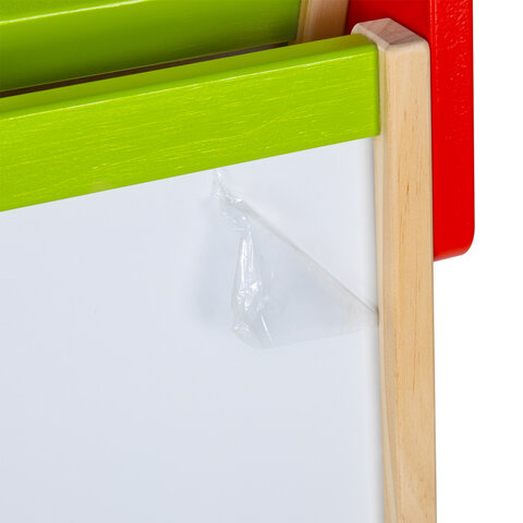 Поверхность мольберта белого цвета предназначена для рисования специальным маркером для белой доски, а также для размещения магнитов; черная поверхность - для рисования мелками. Для детей старше 3-х лет. Регулируется по высоте от 90 до 110 см для удобства использования детьми разного возраста и роста. Размер рабочей поверхности: 43х48 см. Цвет рамки: зеленый.