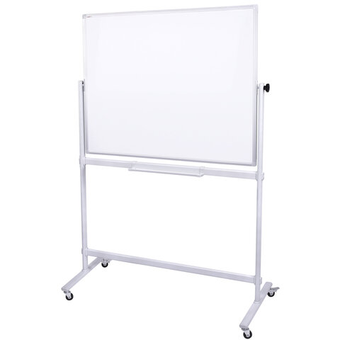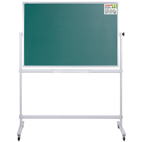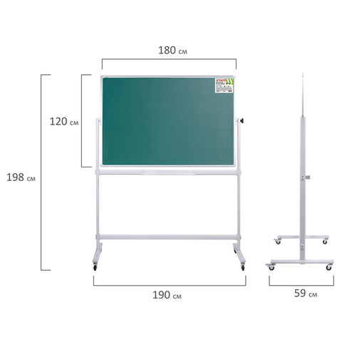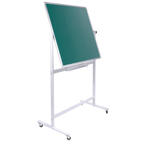 Белая рабочая поверхность с лаковым покрытием предназначена для письма специальными маркерами для белой доски и позволяет размещать информацию при помощи магнитов. Зеленая рабочая поверхность предназначена для письма и рисования мелками. Вращается в горизонтальной плоскости на 360 градусов. Перемещается на колесиках. Элементы крепления входят в комплект. Размер доски: 120х180 см.