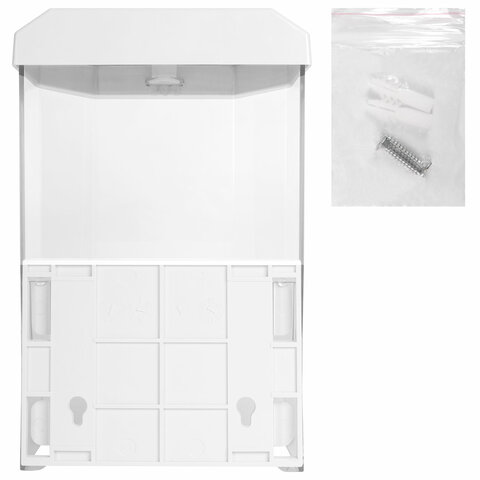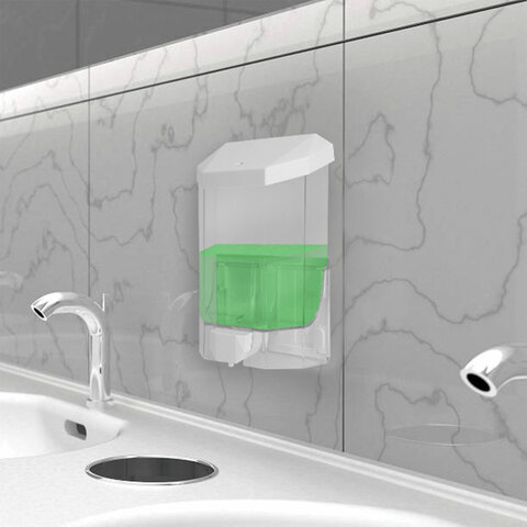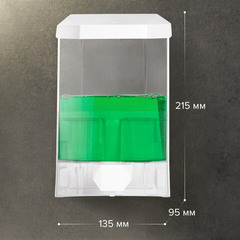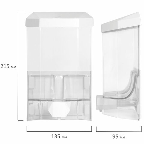 Дозатор из прозрачного пластика объемом 1 л обеспечивает высокую гигиеничность. Выдача мыла осуществляется экономичными порциями. Сочетается с расходными материалами других производителей. Имеется окно для контроля уровня мыла. Закрывается на пластиковый ключ. Размер: 215х135х95 см. Крепежные материалы в комплекте.