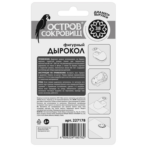 Режущие части, изготовленные из высококачественного металла, защищены пластмассовым корпусом, что делает дырокол ОСТРОВ СОКРОВИЩ безопасным для детей. Дыроколом можно работать по бумаге, картону и пористой резине плотностью от 80 до 200 г/м2.