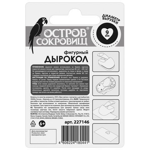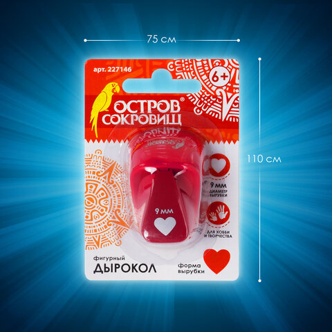 Дырокол компактный и удобный в применении, размер - 5,3х7,5х11 см. Диаметр пробиваемого отверстия - 9 мм, форма вырубки - сердце. Режущие части, изготовленные из высококачественного металла, защищены пластмассовым корпусом, что делает дырокол ОСТРОВ СОКРОВИЩ безопасным для детей. Дыроколом можно работать по бумаге, картону и пористой резине плотностью от 80 до 200 г/м2.